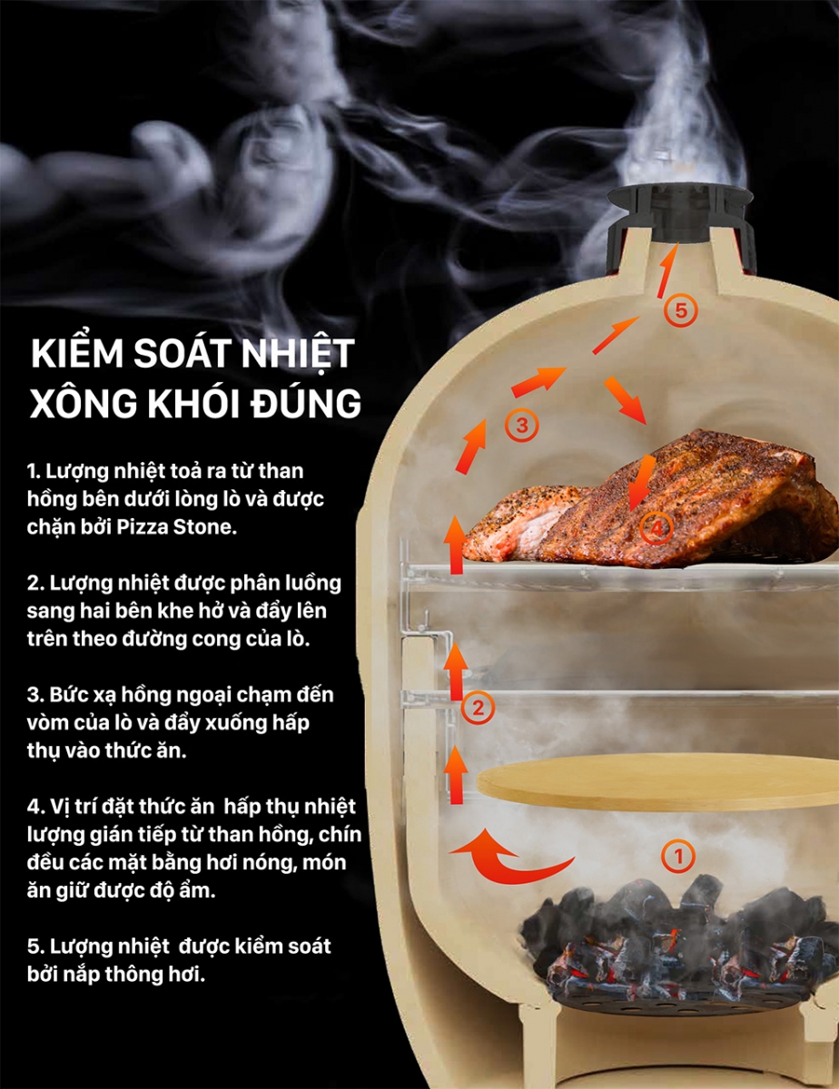 Lò nướng NodaKamado với cách nướng chín hơi nhờ vào việc đối lưu luồng nhiệt, tối ưu bức xạ nhiệt bởi lòng gốm chặn bức sóng hồng ngoại rất tốt. Luồng nhiệt truyền vào các mặt của thức ăn, giúp món ăn chín đều, mọng nước Khác biệt hoàn toàn với các kiểu nướng nhanh.
